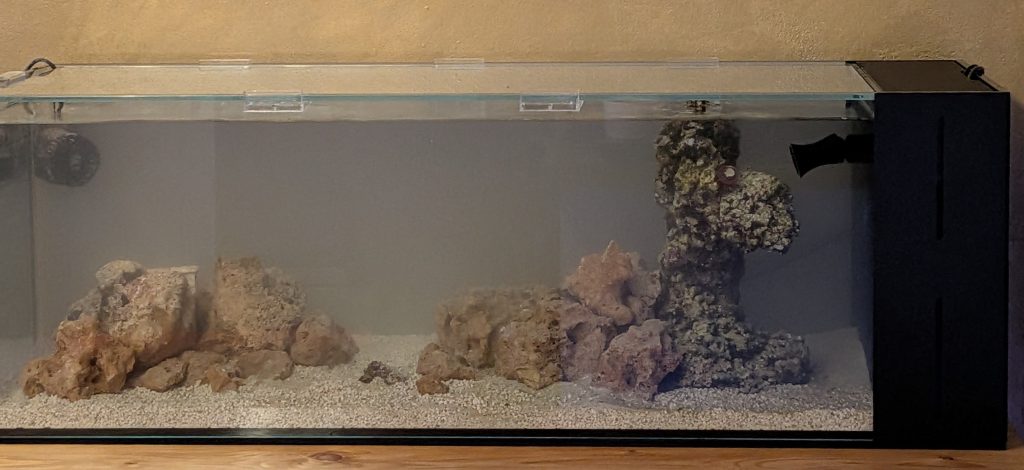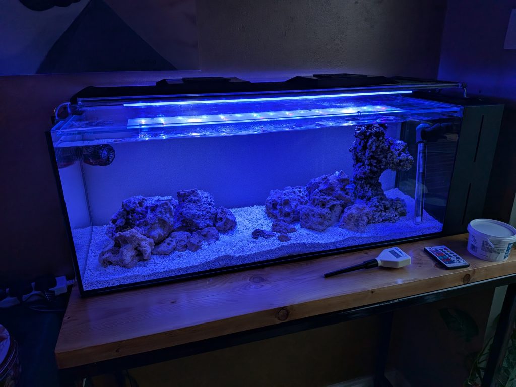 As you can see from the photos the water looked very cloudy after filling. This is because I didn’t clean my sand before putting it in the tank (schoolboy error). After adding some filter floss and waiting around 24 hours the water was crystal clear. I noticed there wasn’t much water movement on the side furthest from the return pump so I added a small powerhead in the top left corner. With the tank\stand at this height I can barely see the powerhead.